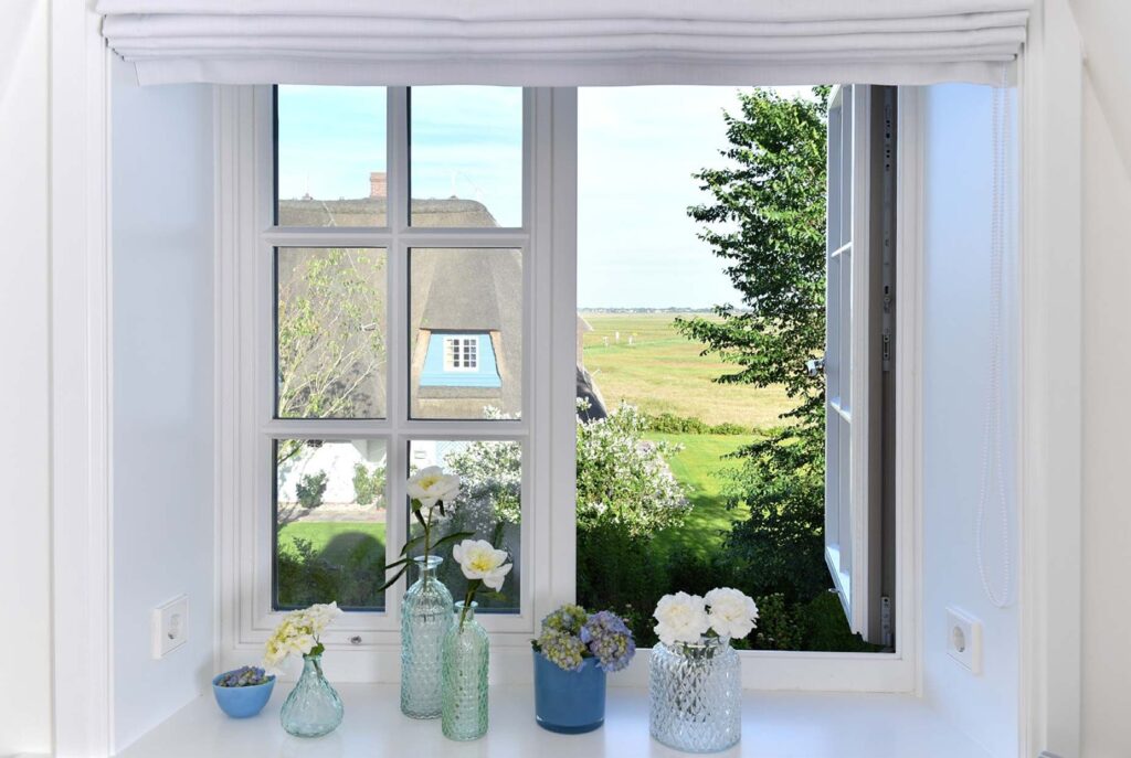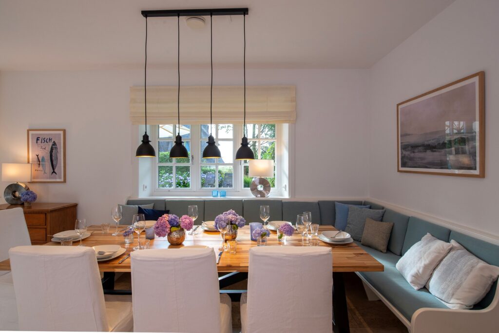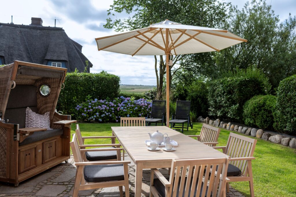 Das großzügige 5-Sterne Ferien Domizil im Kairem Ingiwai 22C erstreckt sich über drei Ebenen und bietet auf 160 m² viel Platz für maximal sieben Personen. Der neu erbaute Hausteil unter Reetdach wurde im Frühjahr 2017 fertiggestellt und liegt ruhig am Rande von Keitum. Das Haus ist im modernen Landhausstil eingerichtet und um einige harmonisch ausgewählte antike...Weiterlesen Möbelstücke ergänzt. Der Esstisch mit einer großzügigen Sitzecke lädt zu Spieleabenden und gemütlichem Abendbrot mit der ganzen Familie ein. An kühleren Tagen spendet der Gaskamin eine wohlige Wärme. Helle und freundliche Farbtöne gepaart mit ausgewählter Kunst verbreiteten friesischen Charme. Die idyllisch gelegene Ost-Terrasse lädt zum Verweilen und Entspannen ein. Der Blick schweift über die weiten und ruhigen Salzwiesen zwischen Keitum und Morsum. Wärme schenkt die Sauna im Souterrain und belebt nach kalten Wattspaziergängen.Weniger lesen