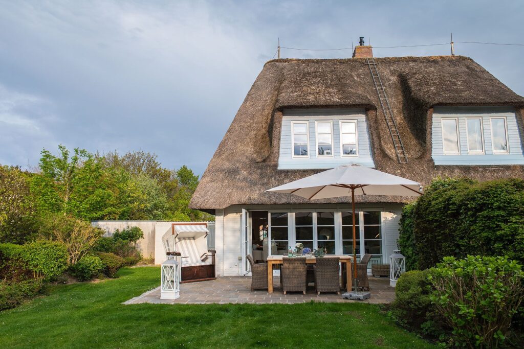 Das exklusive 5-Sterne Ferien Domizil an der Keitumer Süderstraße 13 erstreckt sich über zwei Ebenen und bietet auf 100 m² ausreichend Platz für bis zu vier Personen. Das Ferien Domizil unter Reet wurde im Jahr 2018 umfassend und hochwertig renoviert. Das Blau und Grau der Wände in den oberen Schlafräumen und der mit viel Liebe zum Detail ausgesuchten Wohnaccess...Weiterlesenoires schaffen eine entspannende und beruhigende Wohlfühlatmosphäre. Im lichten, offenen Wohn- und Esszimmer befindet sich ein großzügiger Esstisch und eine kuschelige Wohnlandschaft. Nach einem ausgiebigen Strandspaziergang laden an kalten Tagen der Kamin im Wohnzimmer sowie die Sauna im Obergeschoss zum Entspannen und Wohlfühlen ein. Ein ideales Domizil auch für die ruhigere Jahreszeit. Die nach Süd-Westen ausgerichtete in Naturstein ausgeführte Terrasse öffnet den Wohnbereich zu den Sonnenplätzen im 750 m² großen Garten. Es ist ein wunderbarer, sonnenbeschienener Rückzugsort mit Gartenmöbeln und Strandkorb. Hier lässt sich die Freiheit, die eines großen Gartens zu eigen ist, finden und intensiv genießen.Weniger lesen